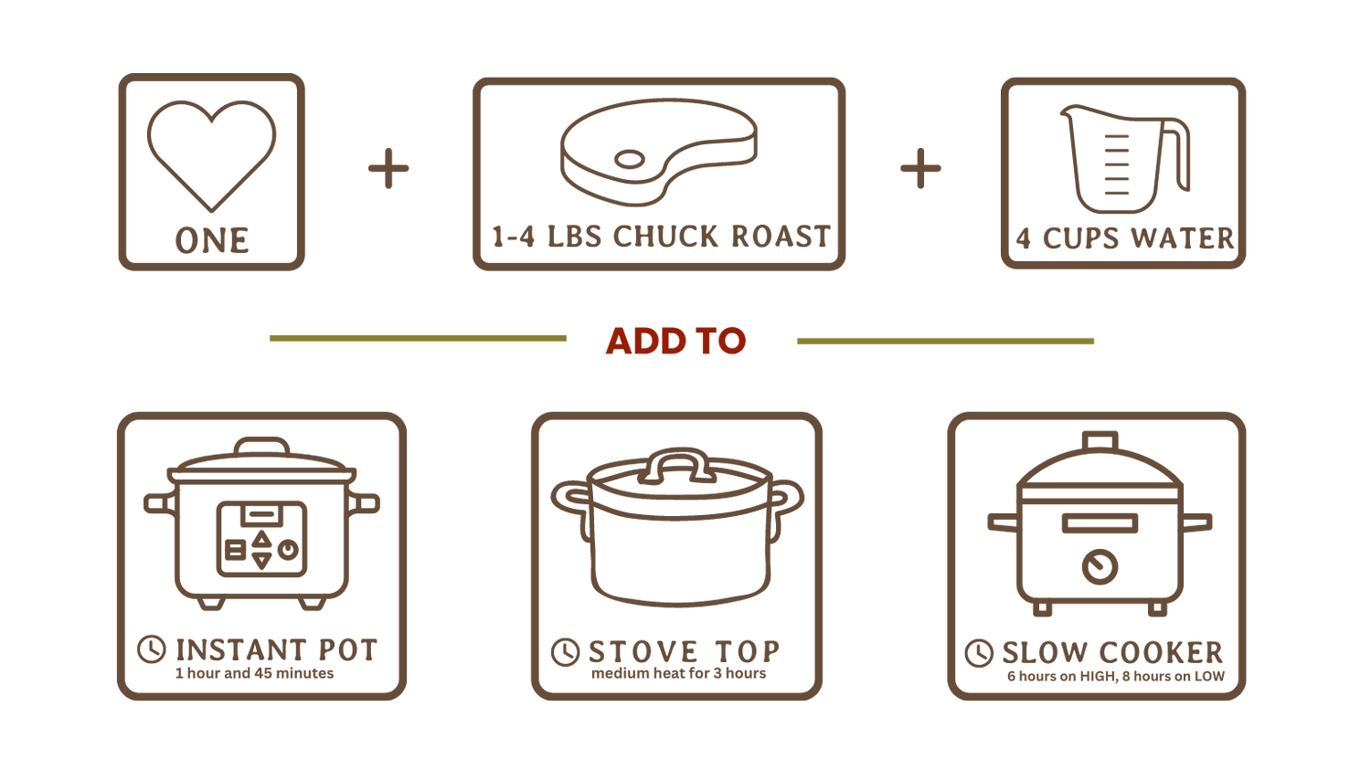 Pick from one of 3 easy cooking methods, add your meat and water, and then Just Add Luv!